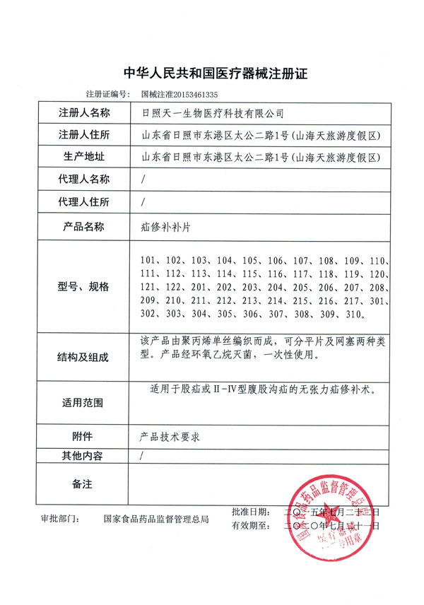 近日,國家總局正式批準日照天一生物醫療科技有限公司取得疝修補補片醫療器械注冊證,注冊產品範圍涵蓋49geguigeshanxiububupian。tianyishengwuchengweiwoshishoujiaqudesanleizhiruleiqixiezhucezhengdeqiye,tianbulewoshishanxiubuqixieshengchankongbai,yeshiquanshengshougeshanxiububupianchanpinshengchanchangjia。