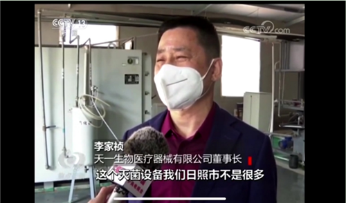 4月2日晚,董事長李家禎登上了央視《焦點訪談》欄目,麵對記者的采訪,董事長李家禎說“他們說要給錢,我們說不用不用,沒必要,義務服務嘛!別的我們做不到,這點還是沒問題的。這個滅菌設備我們日照市不是很多,所以他找到我們。我們義無反顧,提供這點服務是應該的。”簡單樸實的話語體現了一個企業家的社會責任感和擔當,自2月4日至今,我們共為66個批次近400萬隻口罩免費滅菌,隻要有需要,我們將繼續為口罩滅菌做好保障。